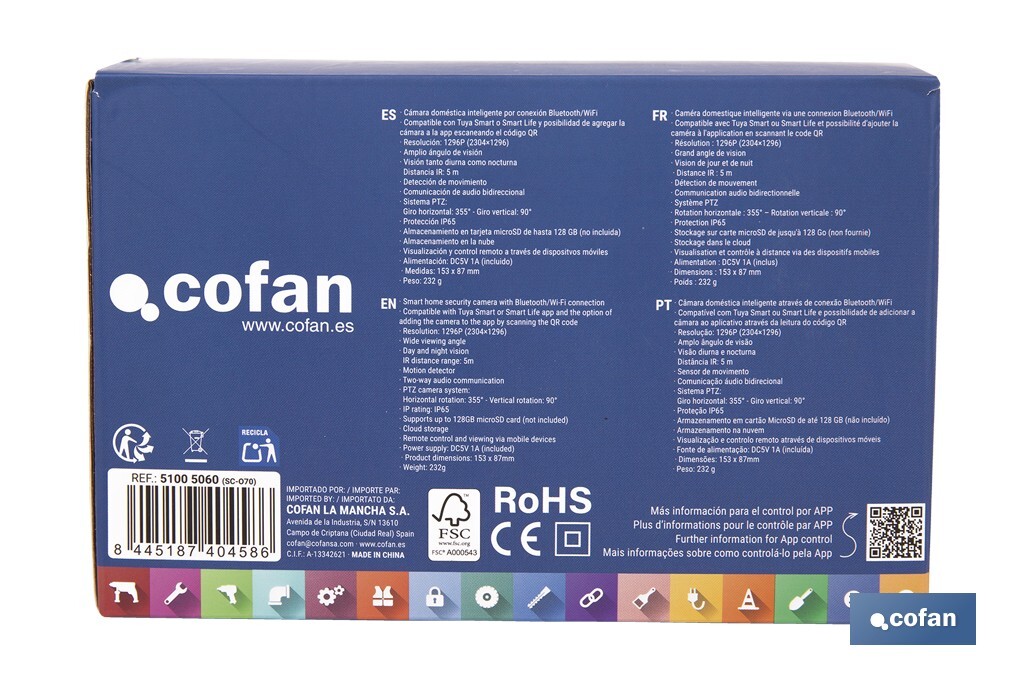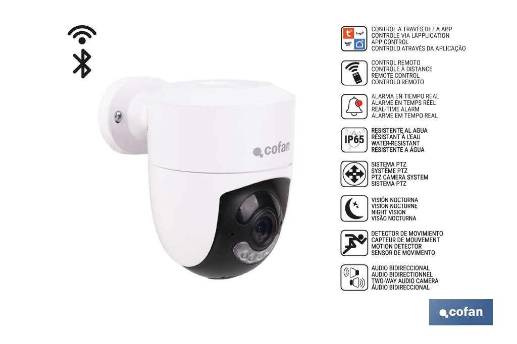 Descubre una nueva forma de proteger lo que más te importa con esta cámara de vigilancia inteligente WiFi para interiores y exteriores. Diseñada para ofrecer tranquilidad total y control desde cualquier lugar del mundo, esta cámara combina tecnología avanzada, conectividad total y un diseño resistente, adaptándose tanto a hogares como a negocios. · Seguridad 24/7 en tiempo real. Gracias a su conexión WiFi y Bluetooth, la cámara garantiza una transmisión estable y continua. Compatible con TuyaSmart y Smart Life, puedes controlar todos los aspectos de tu seguridad desde tu móvil: visualizar en directo, revisar grabaciones, activar alertas, comunicarte con personas y mucho más. · Visión sin límites, incluso en la oscuridad. Su amplio ángulo de visión de 355º horizontal y 90º vertical, junto con su visión nocturna de alta definición de hasta 5 metros, aseguran que no pierdas detalle en ningún momento, tanto de día como de noche. Ideal para supervisar espacios interiores como salones o habitaciones, así como áreas exteriores como entradas, patios o negocios. · Alertas inteligentes y reacción inmediata. El sistema de detección de movimiento en tiempo real te enviará notificaciones instantáneas al smartphone si detecta actividad. Además, la función de audio bidireccional permite escuchar y hablar desde la app, lo que resulta útil para dar indicaciones, disuadir intrusos o hablar con familiares desde cualquier lugar. · Resistencia total para exteriores. Con certificación IP65, la cámara es resistente al agua y al polvo, soportando condiciones climáticas adversas sin problema. Es robusta, duradera y está preparada para uso en exteriores sin perder calidad ni funcionalidad. · Almacenamiento seguro y flexible. Tienes la posibilidad de guardar grabaciones en tarjeta TF de hasta 128 GB o directamente en la nube, para que nunca pierdas contenido importante. Esto te permite revisar lo sucedido en cualquier momento desde la app. · Instalación rápida y sencilla. La cámara se instala fácilmente mediante escaneo de código QR y se incluye con tornillería para fijarla a la pared. Las medidas de la cámara son 12 x 10 x 9 cm y su peso ligero (0,23 kg) facilita su colocación en cualquier rincón del hogar o negocio.
